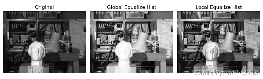 - 直方图均衡考虑了全局的对比度,在许多情况下不能很好适应,如下图直方图均衡后背景对比度有所改善。但是比较两幅图像中雕像的脸。由于亮度过高,我们丢失了大部分信息