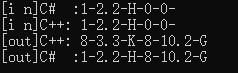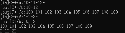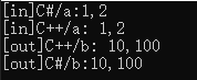 Console.WriteLine("[out]C# :" + a + "-" + b + "-" + c + "-" + d + "-" + e + "-" + f);