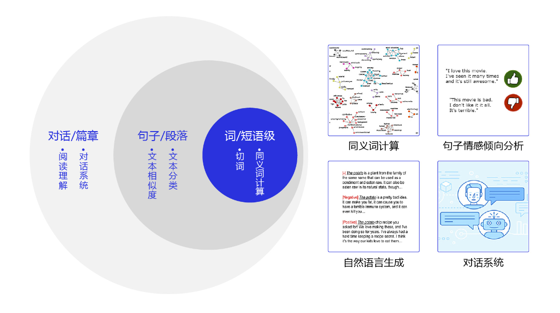 - 对话和篇章级任务:包括机器阅读理解(如使用医药说明书回答患者的咨询问题)、对话系统(如打造一个 24 小时在线的 AI 话务员)等复杂的自然语言处理系统等