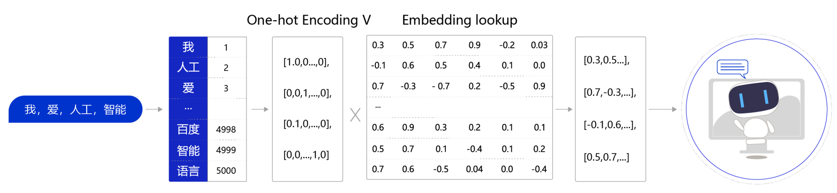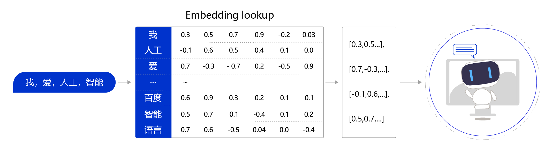 - 查询表 (Embedding Lookup):自然语言单词是离散信号,比如:“我”、“ 爱”、“人工智能”。如何把每个离散的单词转换为一个向量?通常情况下,我们可以维护一个的查询表。表中每一行都存储了一个特定词语的向量值,每一列的第一个元素都代表着这个词本身,以便于我们进行词和向量的映射。给定任何一个或者一组单词,我们都可以通过查询这个 excel,实现把单词转换为向量的目的,这个查询和替换过程称之为 Embedding Lookup![]()