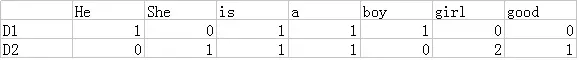 - 上图是:两份文档的词嵌入方式,分别是 D1: He is a boy.、D2: She is a girl, good girl.,得到矩阵后每个文档用词向量的组合来表示,每个词的权重用其出现的次数来表示