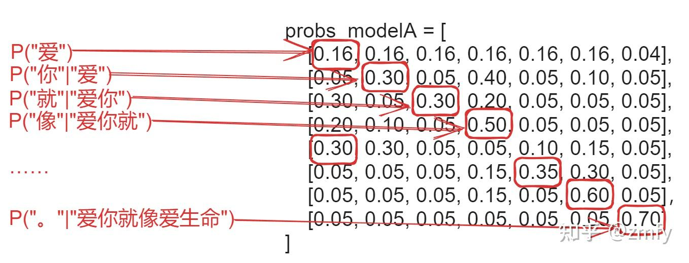 - 2)现在我们有两个语言模型 A 和 B,一般情况下,使用 GPT 类模型生成上面这句话的时候,我们会拿到形状为 [句子长度,词表长度] 的概率矩阵1