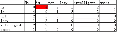 - 共现特征向量,假设有如下语料库:He is not lazy. He is intelligent. He is smart.,如果 Context Window 大小为 2,那么可以得到如上的共现矩阵