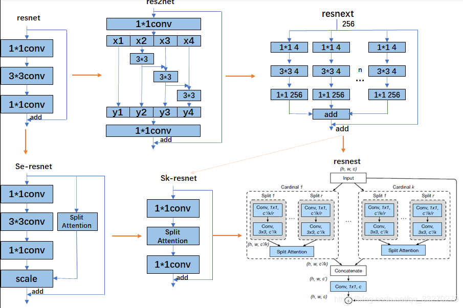 - ResNet 系列模型主要演化方向包括 2 种:split-transform-merge,squeeze-and-attention