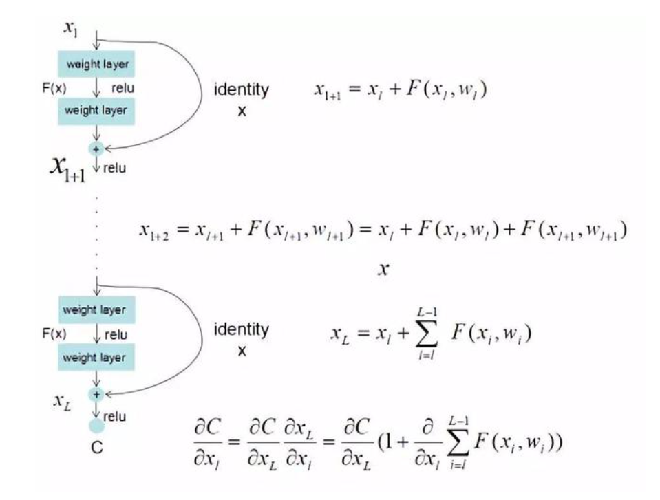 - 由于 h (x)=F (x)+x,使得链式求导后的结果如图所示,不管括号内右边部分的求导参数有多小,因为左边的 1 的存在,并且将原来的链式求导中的连乘变成了连加状态,都能保证该节点参数更新不会发生梯度消失或梯度爆炸现象