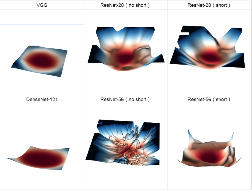 到 ResNet-56 时,不加短连接网络的 error surface 迅速恶化,变得难以优化,引入 shortcut 后,情况改善