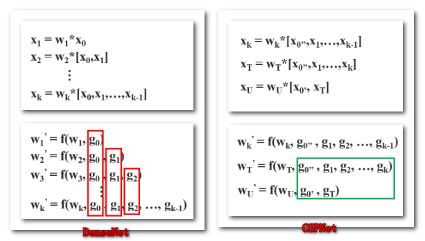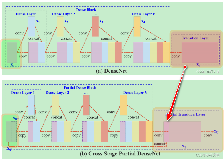 - CSPDenseNet:每个阶段由 partial DenseBlock 和 partial Transition 组成,partial DenseBlock 由 K 个 dense layer 组成,每个保留了 DenseNet 重用特征的有点,同时截断梯度流防止过多的重复梯度