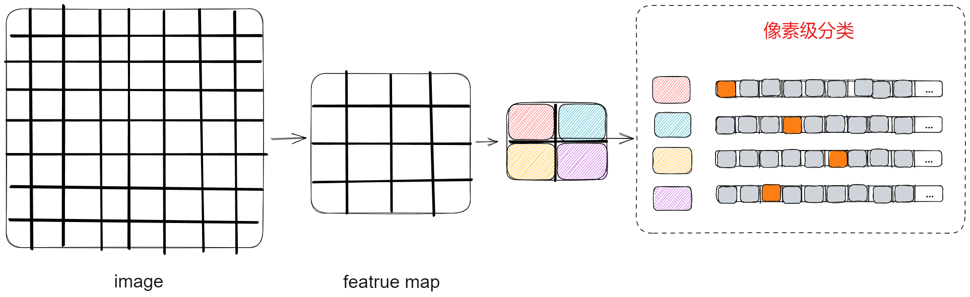 - 图片经过 CNN 提取特征后,得到的是分辨率变小的 2D featrue map,通过上采样将 featrue map 的分辨率变大,然后预测每个 grid 的类别(可以是单标签预测,也可以是多标签)