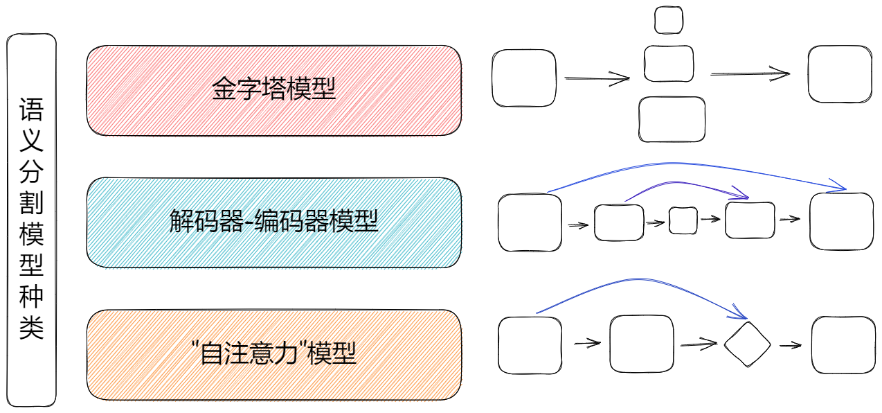 - 金字塔模型:通过构建并融合多尺度特征,实现对不同尺度目标的分割,代表模型有 DeepLab 系列,PSPNet,DANet,APCNet