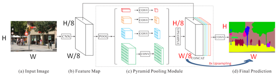 - 金字塔池化模块 (PPM):使用了四种尺寸的金字塔,池化所用的 kerne 分别 1×1, 2×2, 3×3,6×6。池化之后上采样,然后将得到的 feature map, 包括池化之前的做一个级联,后面接一个卷积层得到最终的预测图像