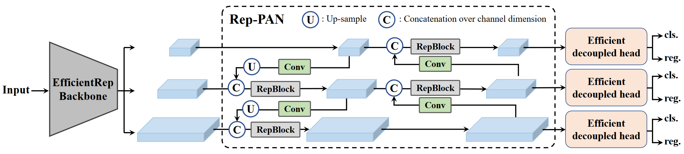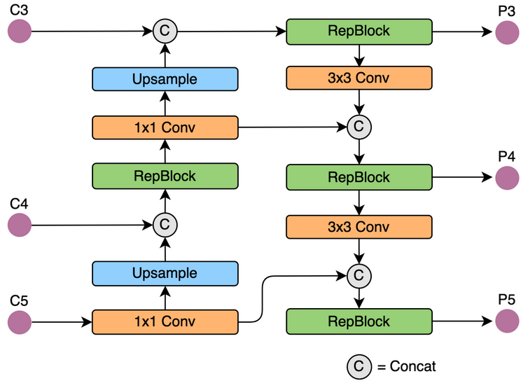 - 基于 PAN 拓扑方式,用 RepBlock 替换了 YOLOv5 中使用的 CSP-Block,同时对整体 Neck 中的算子进行了调整,目的是在硬件上达到高效推理的同时,保持较好的多尺度特征融合能力