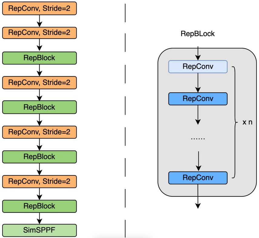 - 基于以上 Rep 算子设计了一个高效的 Backbone。相比于 YOLOv5 采用的 CSP-Backbone,该 Backbone 能够高效利用硬件(如 GPU)算力的 同时,还具有较强的表征能力