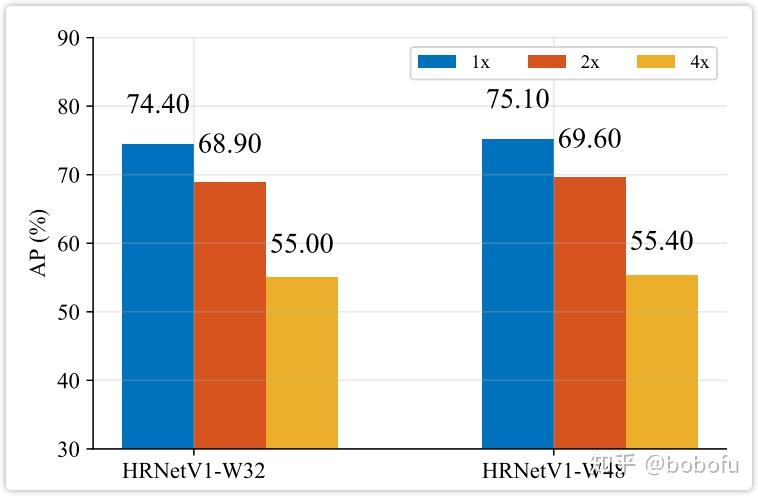 - 研究不同分辨率的特征图如何影响人体姿态估计性能。作者训练了两个 HRNetV1 网络。网络输出从高到低分辨率的四个特征图,最低分辨率特征图上的热图预测质量太低,AP 分数低于 10 分。实验表明,分辨率确实会影响关键点预测质量