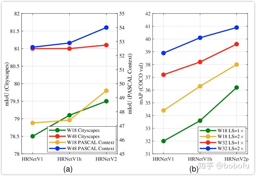 - HR 设计了 3 种方式去使用 4 分支的输出,分别对应 HRNetv1、HRNetv2、HRNetv2p,(a) 只使用最高分辨率的特征;(b) 将所有分辨率的 feature map (小的特征图进行 upsample) 进行 concate,主要用于语义分割和面部关键点检测;© 在 HRNetV2 的基础上,使用了一个特征金字塔,主要用于目标检测
