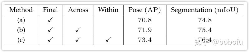 - 研究了网络的三种变体。(a)无中间融合模块:多分辨率支路之间除了最终融合模块外没有融合。(b)跨阶段融合单元:每个阶段内的相同分辨率支路之间没有融合。(c)跨阶段阶段和内融合模块:这是 HRNet 的结构。多分辨率融合模块很有帮助,并且更多的融合会带来更好的性能