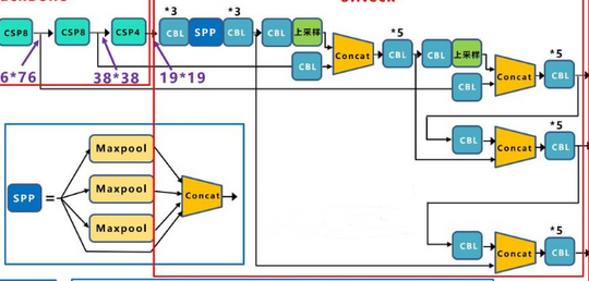 - 特征增强模块,主要由 CBL 组件,SPP 模块和 FPN+PAN 的方式组成