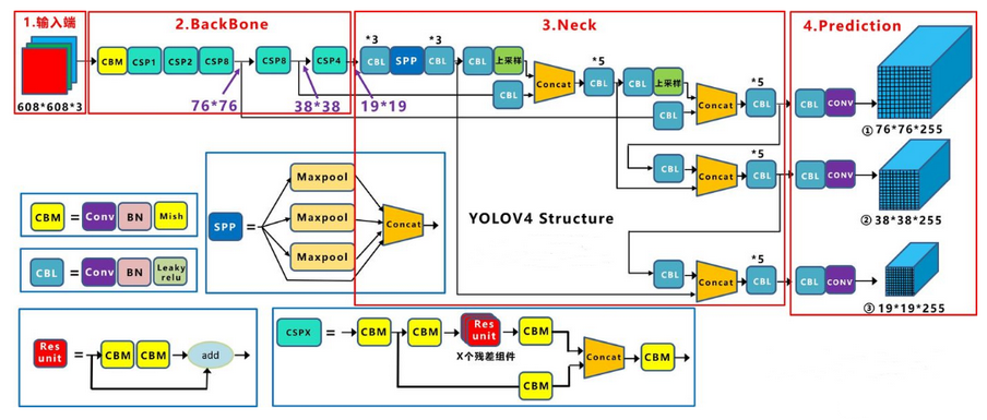 - YOLOv4 = CSPDarknet53+ 空间金字塔池化 (SpatialPyramidPooling,SPP)+ PAN+ YOLOv3 的检测头