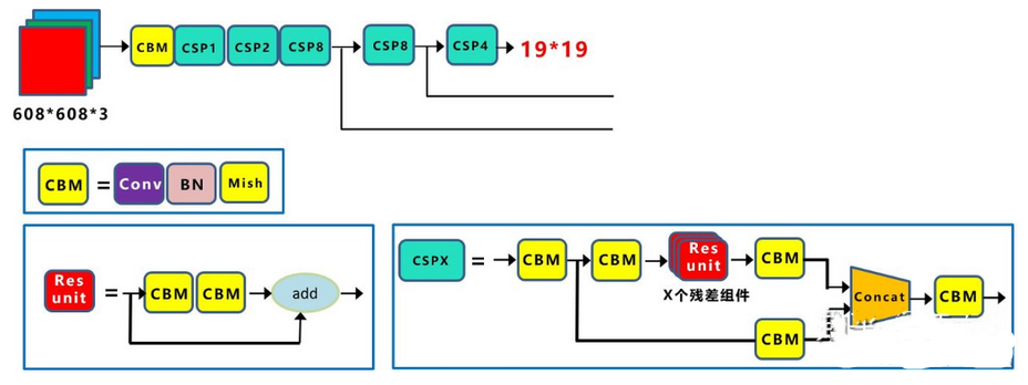 - CSPX: 借鉴了 CSPNet 网络结构,由 CBM 组件和 X 个 Res unint 模块 Concate 组成