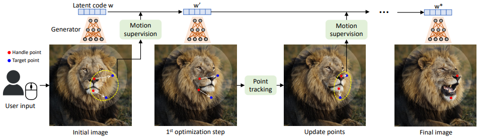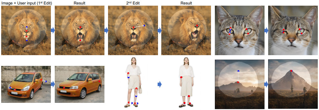 - DragGAN 允许通过交互的方式编辑图像生成效果,交互过程是定义起点(红色)和目标点 (蓝色),红点所在的图像语义信息将移动到蓝点