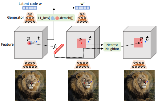 - DragGAN 实现时不是一下子从起始点移动到目标点,而是一步一步递归向目标点移动,所以 DragGAN 要实现以下两个过程