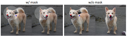 - 当给狗的头上加上掩码时,其他区域几乎固定不变,只有头部移动。如果没有掩码,这个操作会移动整个狗的身体。这也表明,基于点的操作通常有多种可能的解,而 GAN 将倾向于在从训练数据中学习到的图像流形中找到最接近的解。掩模功能可以帮助减少歧义,并保持某些区域的固定