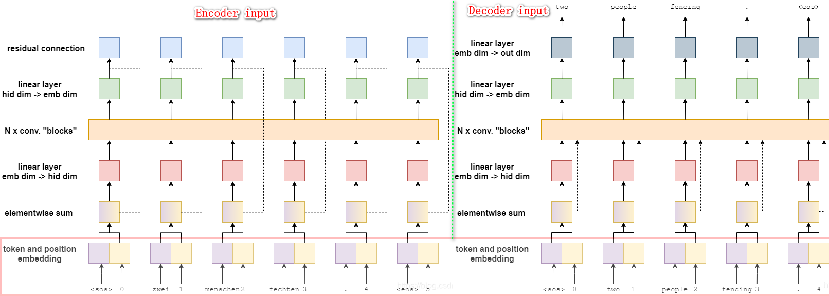 - 典型 Seq2Seq 是使用 RNN 实现的,虽然其可以较好编码序列信息,但是不可以并行计算,因为后一时刻的输出依赖于前一时刻的隐状态,并且 RNN 的学习的依赖都是短程依赖。FaceBook 设想使用 CNN 替换 RNN 学习序列信息,因为 CNN 可以并行计算,并且可以通过叠加多层 CNN,实现远距离依赖