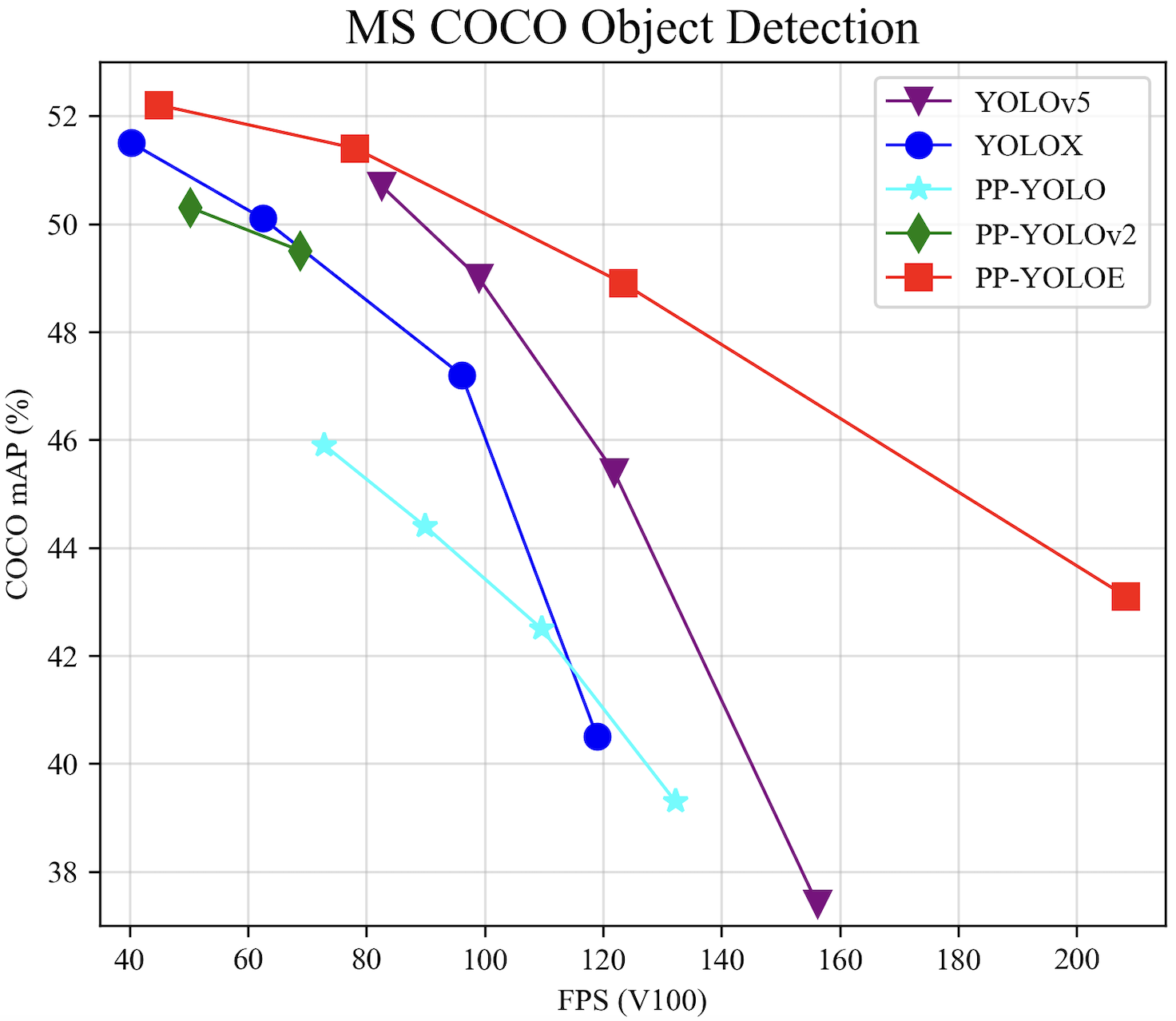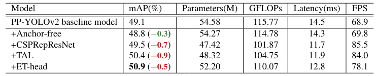 - Paddle 开发的 anchor-free 的多头单框目标检测模型,改进使用更高效的 BackBone,去除 anchor-base,使用类别及定位更加一致的检测头,以及提出任务对齐模型的标签匹配策略,最终模型相比较 YOLOv 5,更适合工业场景