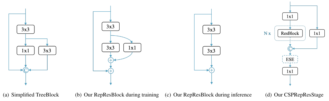 - CSPRepResNet:在 CSPResNet 的基础上,增加 “重参数化” 技巧,训练和推理使用不同的网络结构