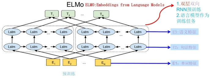- 一个双层双向的 LSTM 模型,预训练时其是自监督学习的,应用到下游时取不同层的 LSTM 使用即可