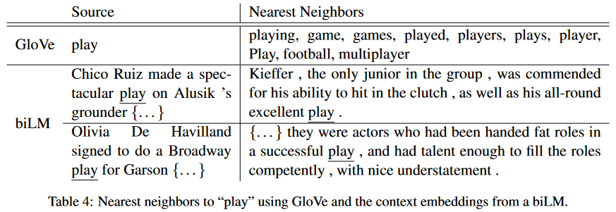 - 表 4 表示两者查询最近词的过程,可以看出 GloVe 是基于共现矩阵,只能得出和 Play 接近的词汇,而 ELMO 是基于语境的,能解决一词多义的问题