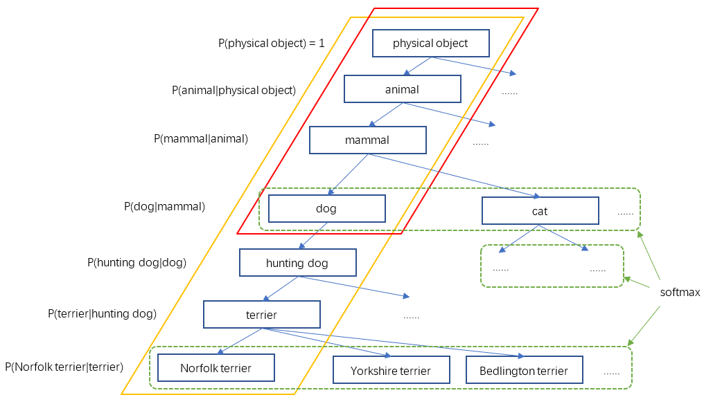 - 整个 WordTree 中的对象之间不是互斥的关系,但对于单个节点,属于它的所有子节点之间是互斥关系。比如 terrier 节点之下的 Norfolk terrier、Yorkshire terrier、Bedlington terrier 等,各品种的 terrier 之间是互斥的,所以计算上可以进行 softmax 操作。上面图 10 只画出了 3 个 softmax 作为示意,实际中每个节点下的所有子节点都会进行 softmax