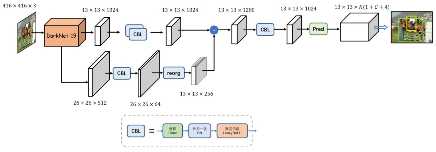 - 在最后一个 pooling 之前,特征图的大小是 26 x26x512,将其 1 拆 4,直接传递到 pooling 后(并且又经过一组卷积)的特征图,两者叠加到一起作为输出的特征图