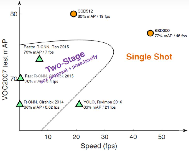 - 目标检测的思想 YOLOv1 划分网格的思想一致,差异在于 SSD 对于每个单元的每个先验框作类别及位置的预测,YOLOv1 对每个单元作类别预测,对单元下的先验框作位置预测