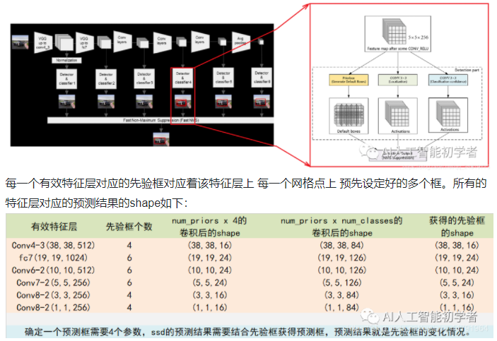 - 输出:包含 6 个尺度共计 8732 个先验框的预测,其中大尺度特征图(较靠前的特征图)可以用来检测小物体,而小尺度特征图(较靠后的特征图)用来检测大物体