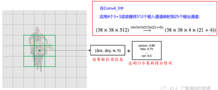 - 对每个单元应用 3×3 卷积滤波器以进行预测 (这些滤波器像常规 CNN 滤波器一样计算结果)。每个滤波器输出 25 个通道:21 个类别分数 +1 个边界框的信息