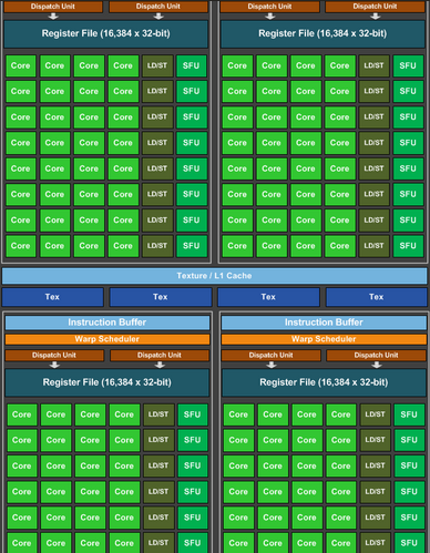 - 每个 SM 包含的 SP 数量依据 GPU 架构而不同,Fermi 架构 GF100 是 32 个,GF10X 是 48 个,Kepler 架构都是 192 个,Maxwell 都是 128 个。相同架构的 GPU 包含的 SM 数量则根据 GPU 的中高低端来定。下图给出 Nvidia GTX980 的一个 SM 示意图,图中每个绿色框框表示一个 SP