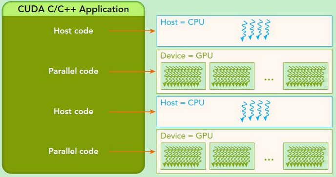 - host 指代 CPU 及其内存,而用 device 指代 GPU 及其内存。CUDA 程序中既包含 host 程序,又包含 device 程序,它们分别在 CPU 和 GPU 上运行。同时,host 与 device 之间可以进行通信,这样它们之间可以进行数据拷贝