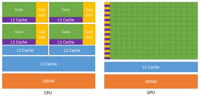 - GPU 包括更多的运算核心,其特别适合数据并行的计算密集型任务,如大型矩阵运算,而 CPU 的运算核心较少,但是其可以实现复杂的逻辑运算,因此其适合控制密集型任务。