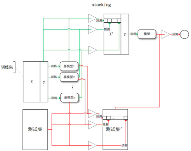 - Stacking 将前一轮学习之后的输出 / 标签组织变换后作为下一轮学习的输入 / 特征,然后再次训练