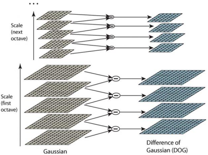 - DOG 金字塔的第 1 组第 1 层是由高斯金字塔的第 1 组第 2 层减第 1 组第 1 层得到的。以此类推