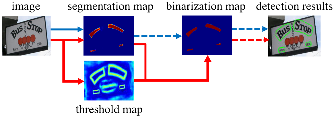- DB 模块:和 DB 一样,以 probability map 减去 threshold map (T) 差值,输入到 DB 模块进行可微的二值化学习