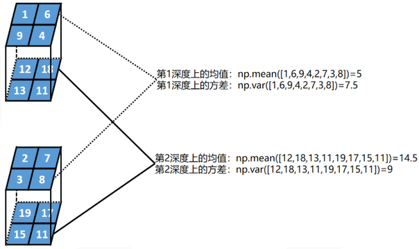 - 第一步:计算每一层深度的均值和方差