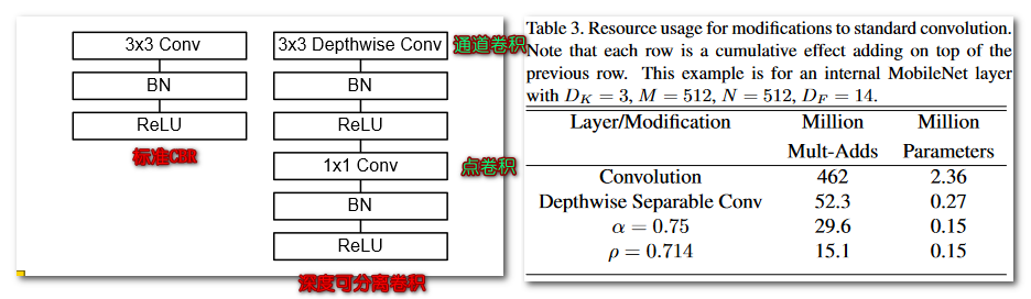- 上图左边是标准卷积和深度可分离卷积的过程,右边是使用宽度因子 、分辨率因子 后对网络计算量的影响