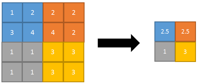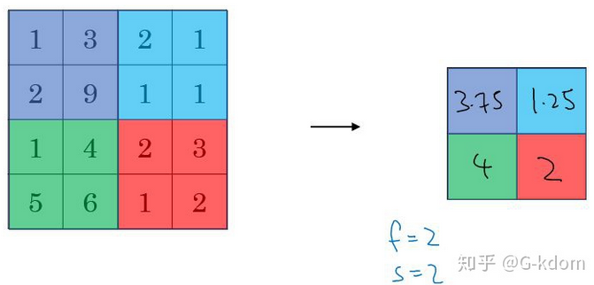 - 类似于标准卷积 (Convolution) 的过程,使用卷积核的方式扫描一个 featrue map 的一个区域,计算该区域的平均值作为输出