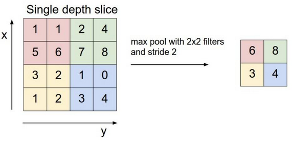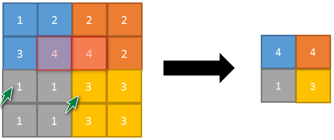 - 类似于标准卷积 (Convolution) 的过程,使用卷积核的方式扫描一个 featrue map 的一个区域,选择该区域的最大值作为输出