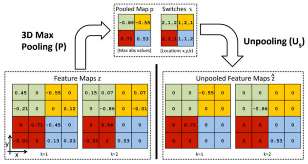 - 以最大池化 (Max pooling) 为例,池化时记住保留最大信息的位置,反池化直接将最大信息填回去,参考:最大池化层反向传播