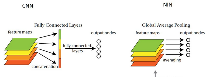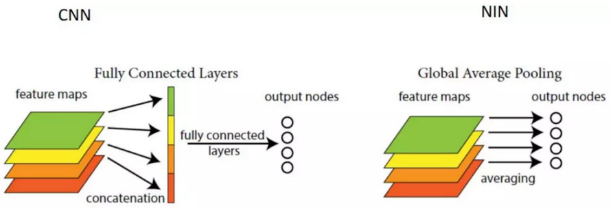 - 全局池化在 NIN 中提出,针对整个特征图进行一次池化操作,可以是平均池化 (Average pooling),也可以是最大池化 (Max pooling)
