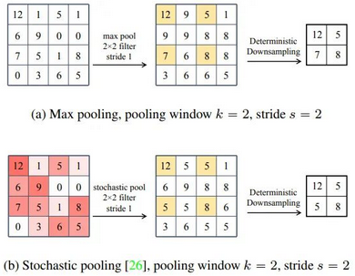 - 只需对 feature map 中的元素按照其概率值大小随机选择,即元素值大的被选中的概率也大。而不像最大池化 (Max pooling) 那样,永远只取那个最大值元素