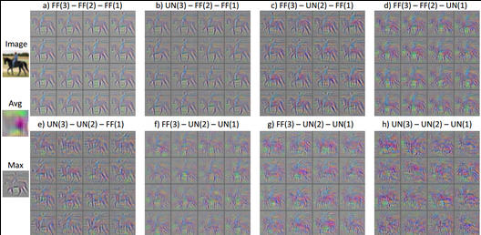 - 随机池化首先根据特征图值的大小概率性选择位置,然后取该位置的最大池化 (Max pooling) 或 平均池化 (Average pooling) 值作为输出,下图使用多项分布抽样 (FF)、均匀分布抽样 (UN) 进行随机位置选择,最大池化和最小池化的效果,可以看出最大池化可以比较好的保留图片中的纹理信息,而平均池化已经失去可辨识的纹理信息