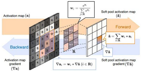 - 软池化 Soft Pooling 是基于 softmax 加权的方法来保留输入的基本属性,同时放大更大强度的特征激活。与 maxpooling 不同,softpool 是可微的,所以网络在反向传播过程中为每个输入获得一个梯度